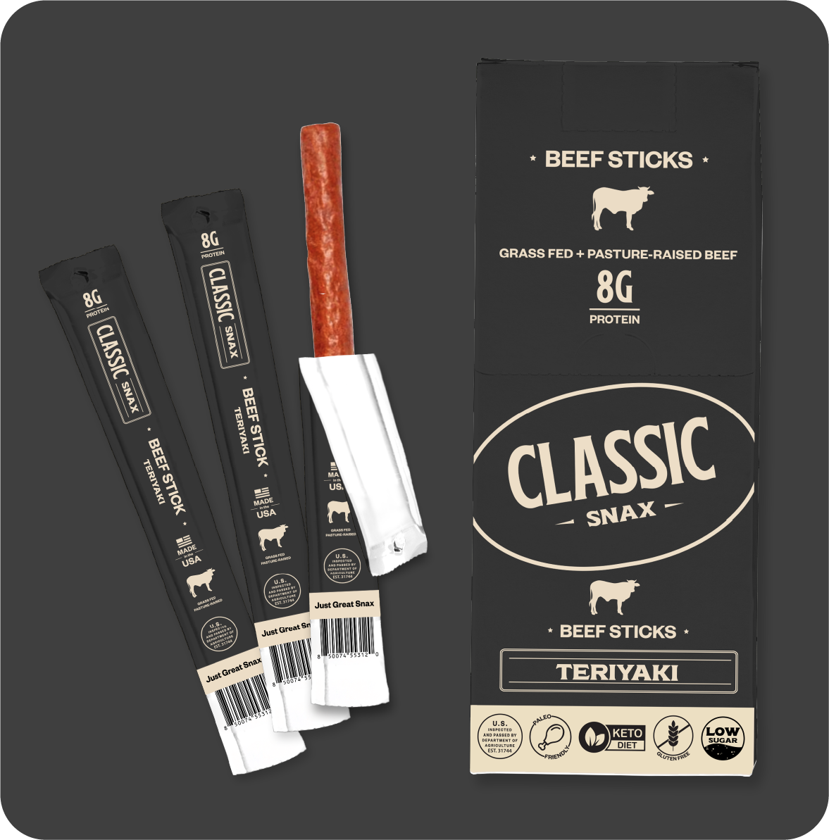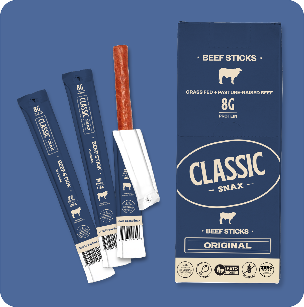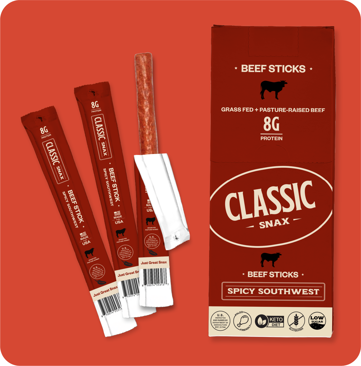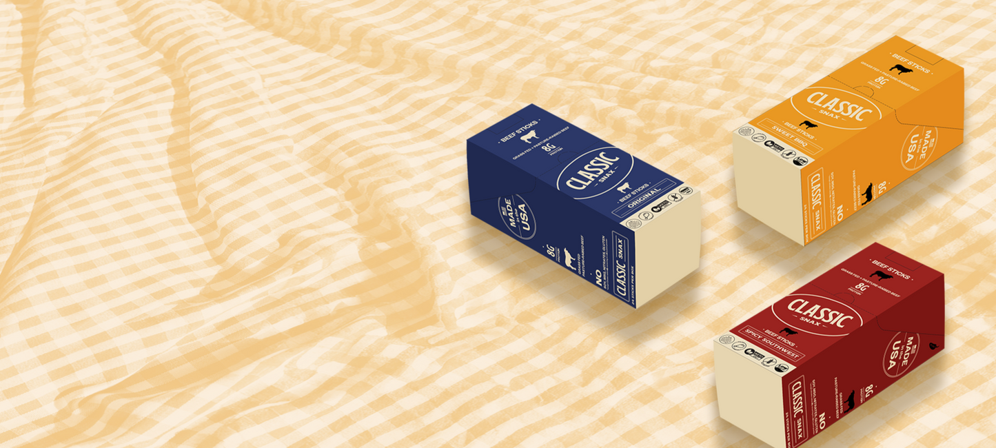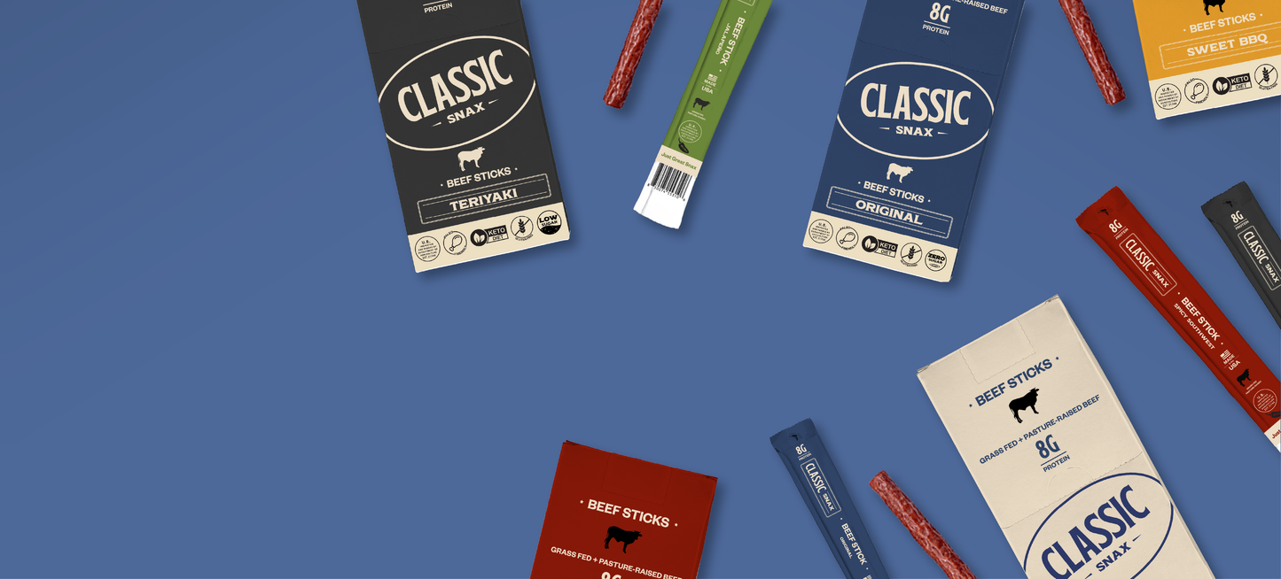 With 8g of protein and a ton of flavor packed into every bite, our beef sticks make an ideal grab'n'go snack wherever life may take you. Classic Snax are gluten free, low sugar, paleo friendly, keto friendly, and proudly made here- in the USA.