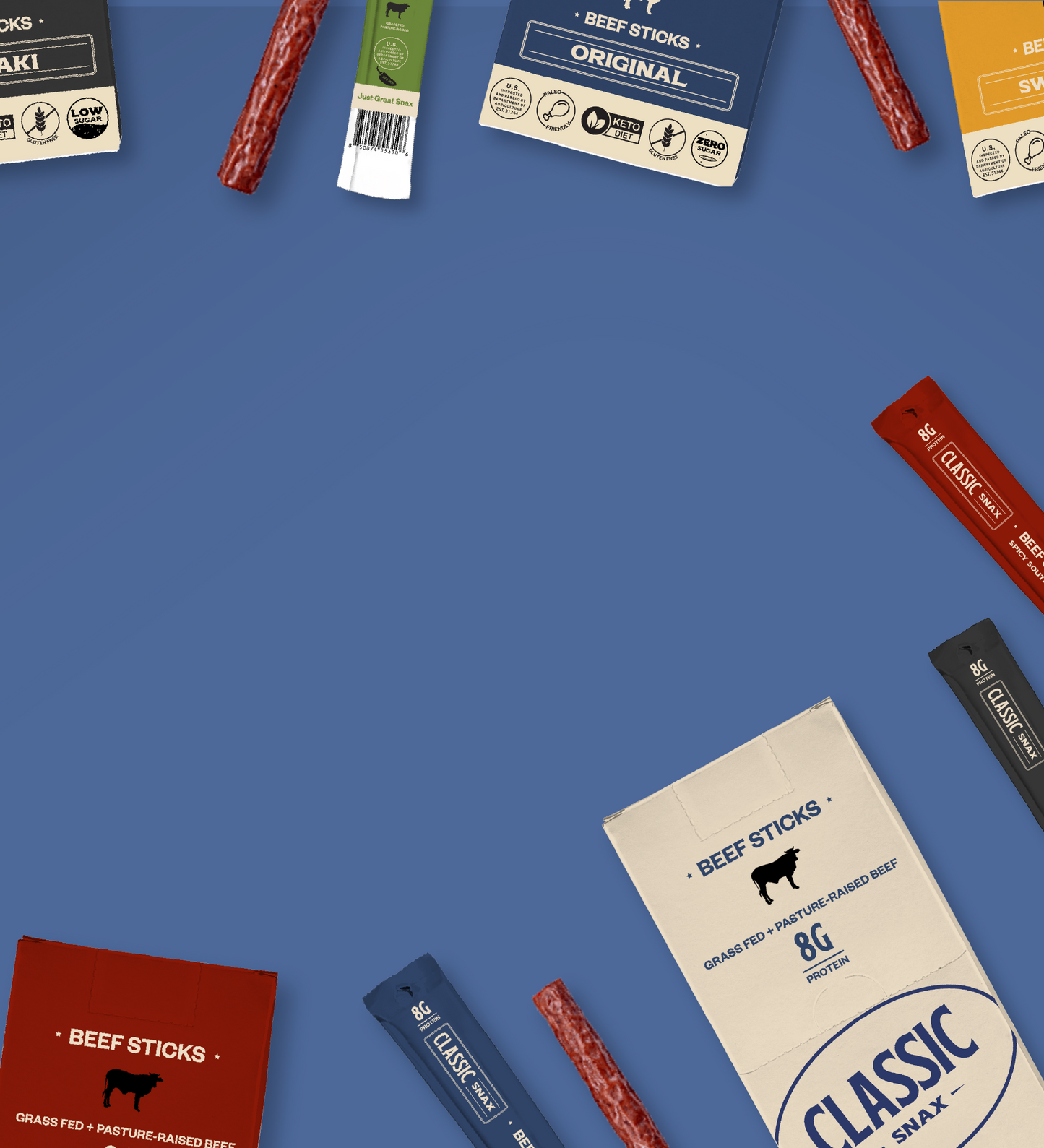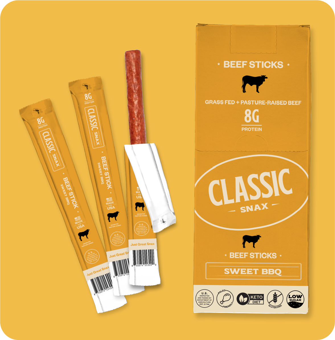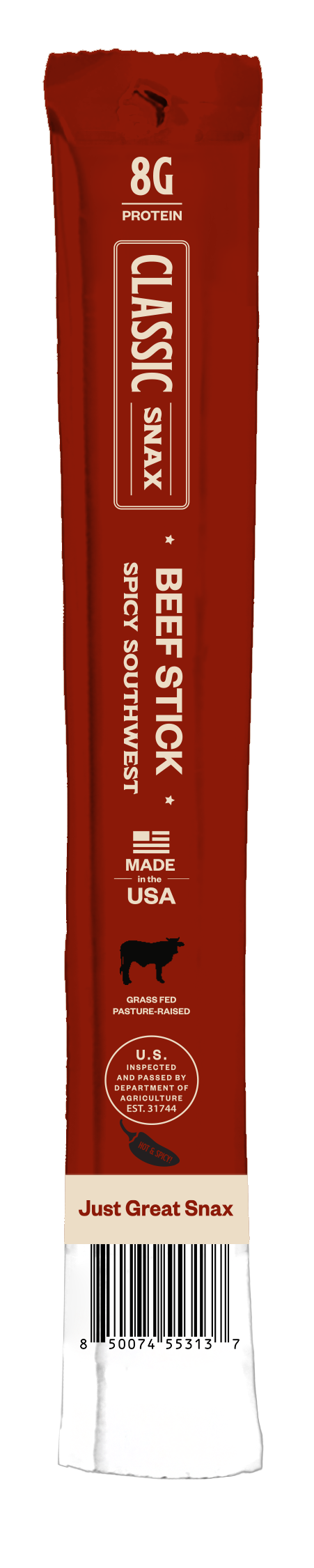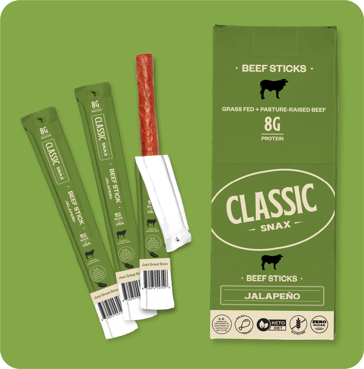 With 8g of protein and a ton of flavor packed into every bite, our beef sticks make an ideal grab'n'go snack wherever life may take you. Classic Snax are gluten free, low sugar, paleo friendly, keto friendly, and proudly made here- in the USA.
